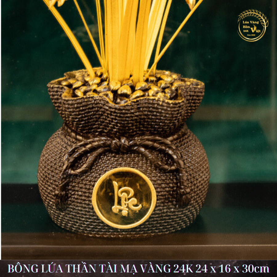 Bông Lúa Thần Tài Mạ Vàng 24K với kích thước 24x16x30cm là một sản phẩm thủ công mỹ nghệ tinh xảo, mang đậm nét văn hóa truyền thống Việt Nam. Với lớp mạ vàng 24K lấp lánh, sản phẩm không chỉ là món đồ trang trí sang trọng mà còn mang ý nghĩa phong thủy sâu sắc, thể hiện ước vọng về sự thịnh vượng, no đủ và tài lộc dồi dào.