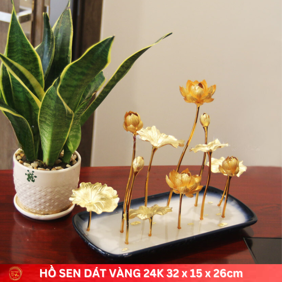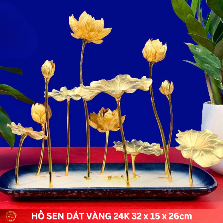 Hồ Sen Dát Vàng 24K với kích thước 32x15x26cm là một tác phẩm nghệ thuật độc đáo, mang đến vẻ đẹp thanh thoát và ý nghĩa phong thủy sâu sắc cho không gian sống. Được chế tác từ chất liệu đồng cao cấp và phủ vàng 24K, sản phẩm này không chỉ là điểm nhấn nổi bật mà còn thể hiện gu thẩm mỹ tinh tế của gia chủ.