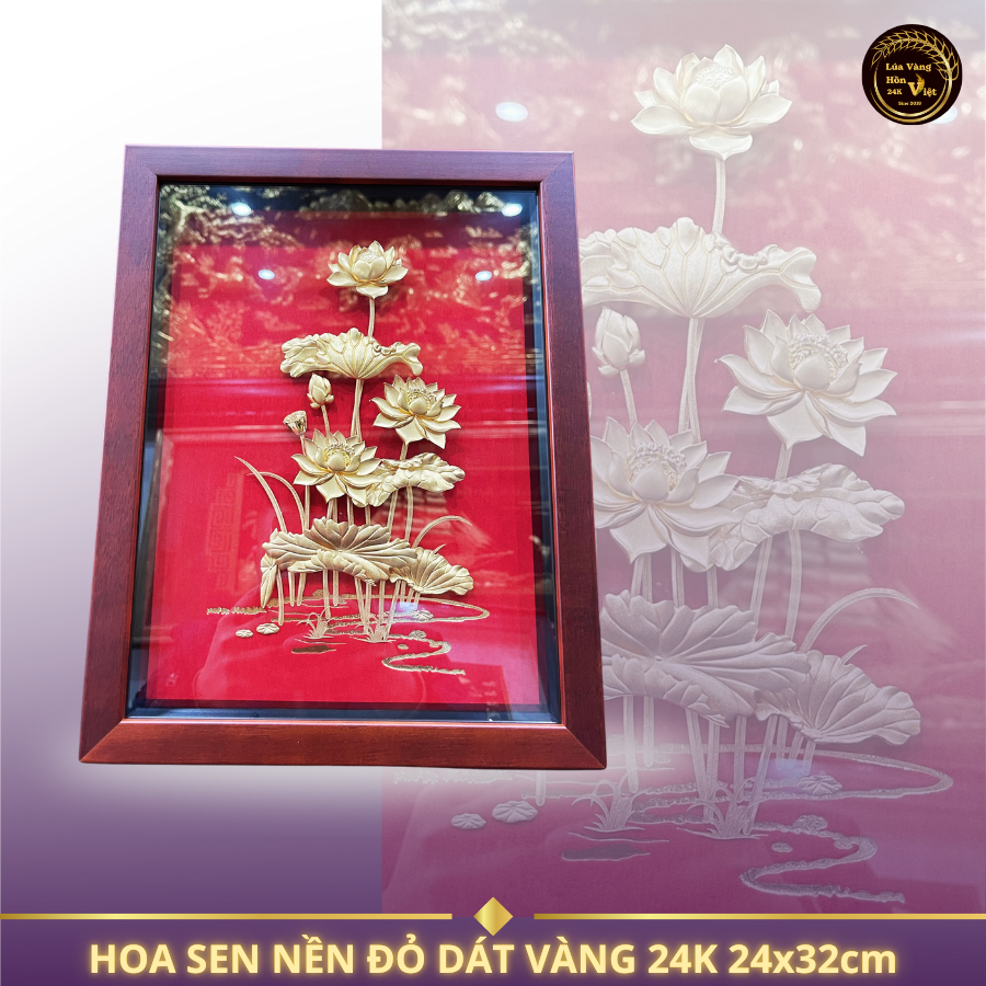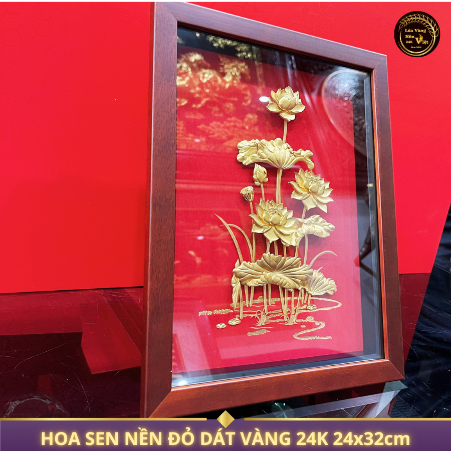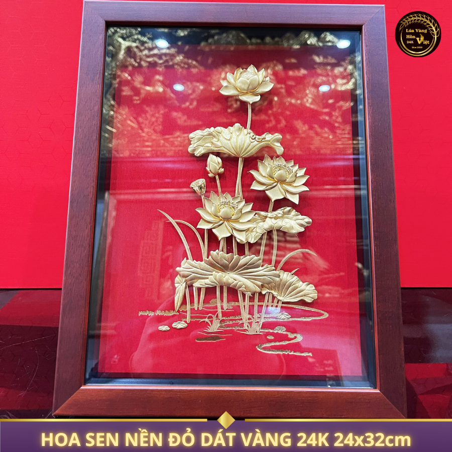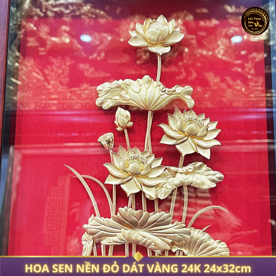 HOA SEN NỀN ĐỎ DÁT VÀNG 24K 24x32cm