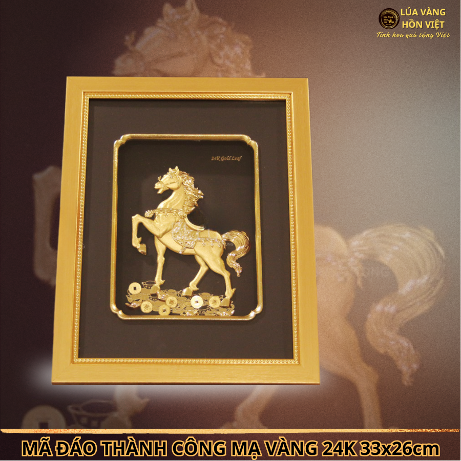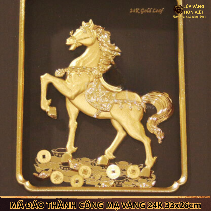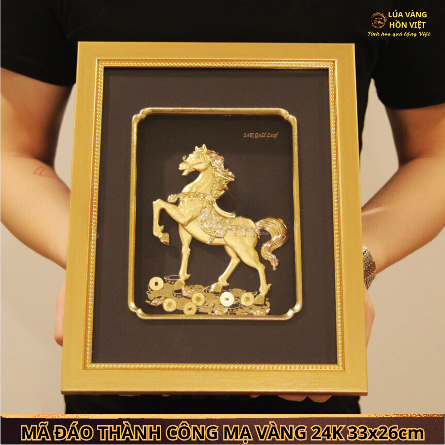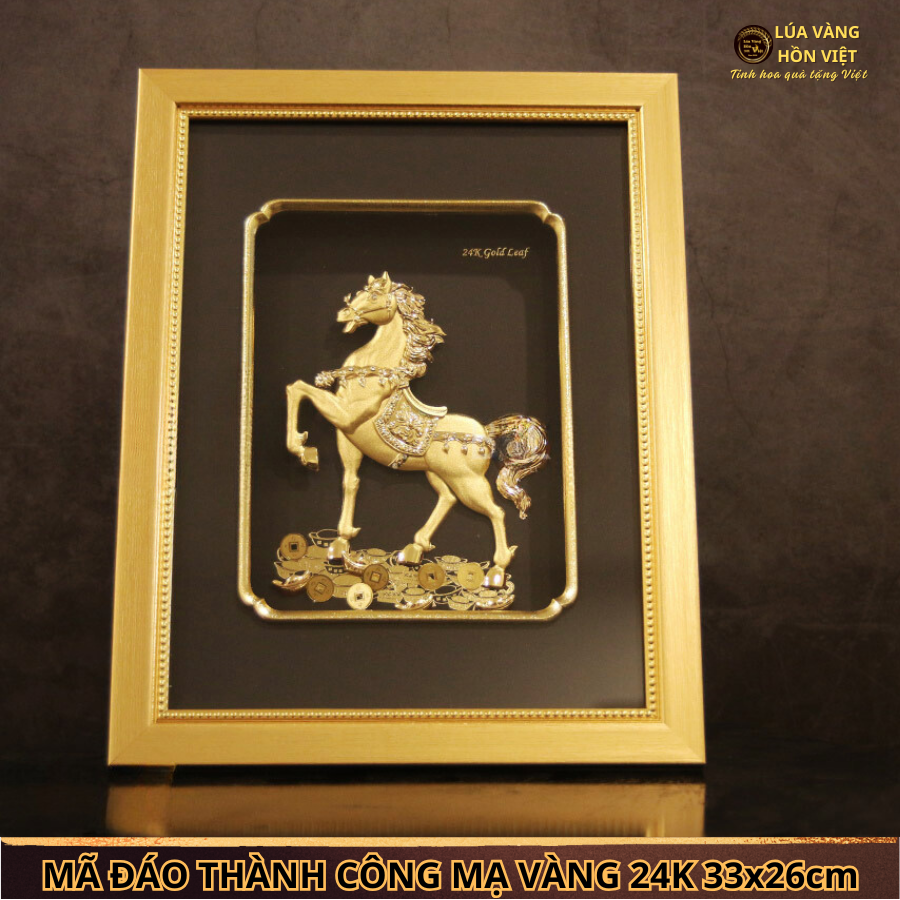 TRANH MÃ ĐÁO THÀNH CÔNG MẠ VÀNG 24K 26x32Cm – BIỂU TƯỢNG CỦA MAY MẮN VÀ THÀNH CÔNG. Bức tranh Mã Đáo Thành Công mạ vàng 24K kích thước 26x32cm là tác phẩm nghệ thuật tinh xảo, mang đậm ý nghĩa phong thủy. Sản phẩm được chế tác bởi các nghệ nhân giàu kinh nghiệm của Lúa Vàng Hồn Việt , phù hợp để làm quà tặng cao cấp hoặc trang trí không gian sống, làm việc.