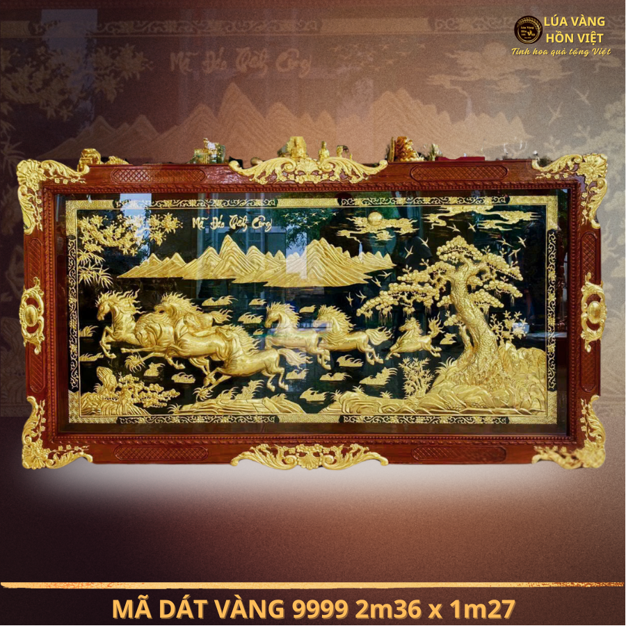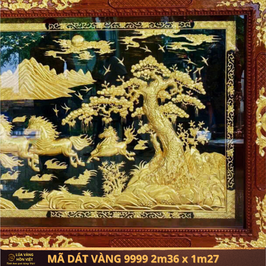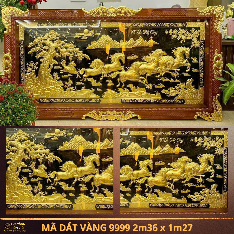 Đặt ngay Tranh Mã Dát Vàng 9999 Kích Thước 2m36x1m27 để không gian của bạn trở nên sang trọng và tràn đầy sinh khí, tài lộc!