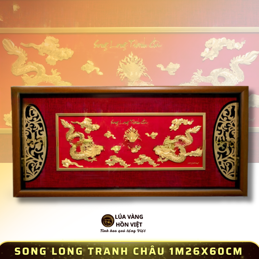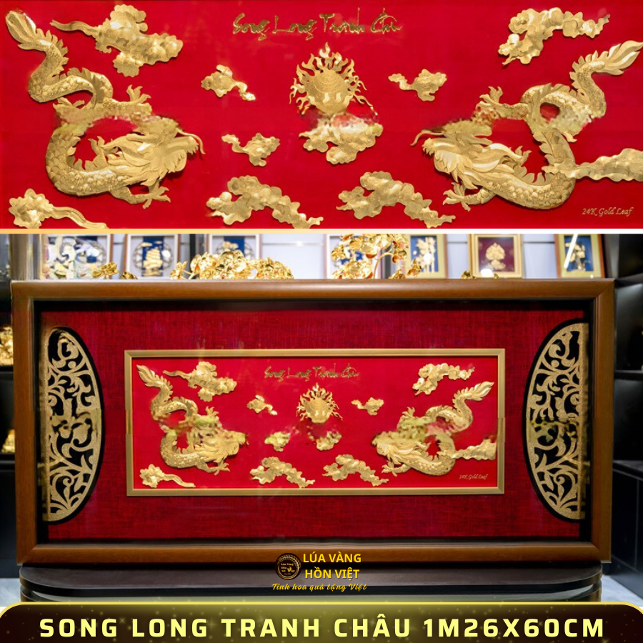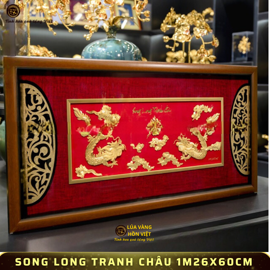 Tranh Song Long Tranh Châu Dát Vàng 24K 1m26x60cm là lựa chọn hoàn hảo để mang lại tài lộc, thịnh vượng và may mắn cho gia đình bạn. Hãy đặt mua ngay hôm nay để sở hữu bức tranh tuyệt đẹp này!