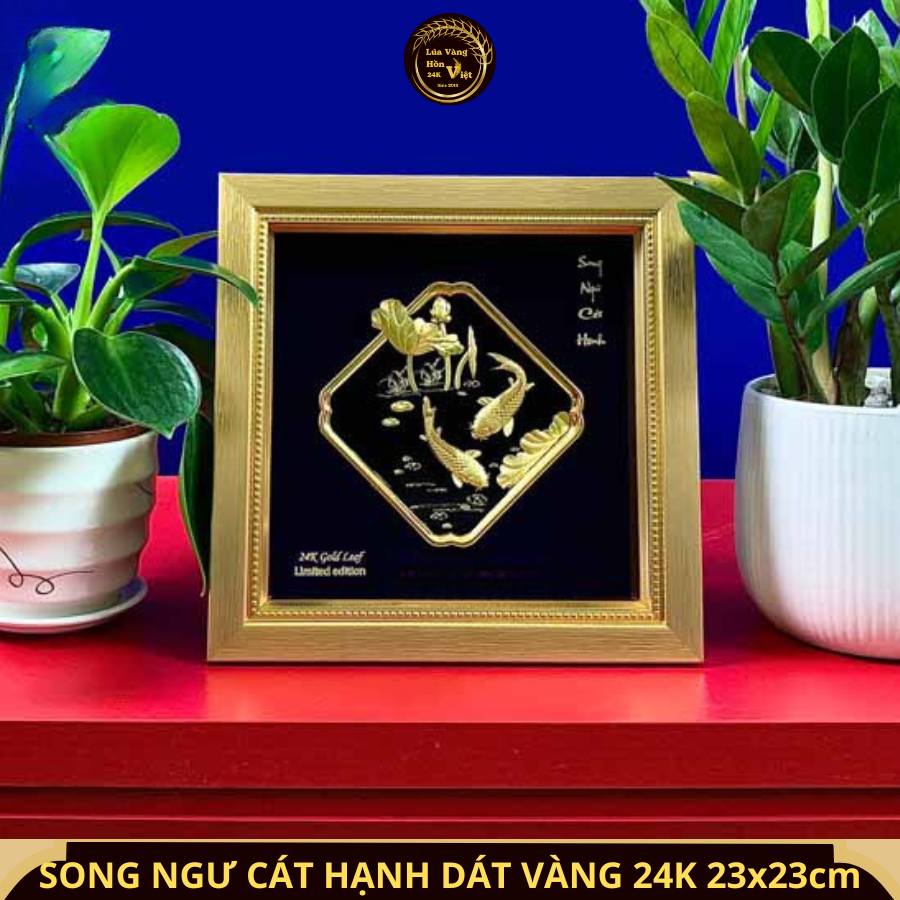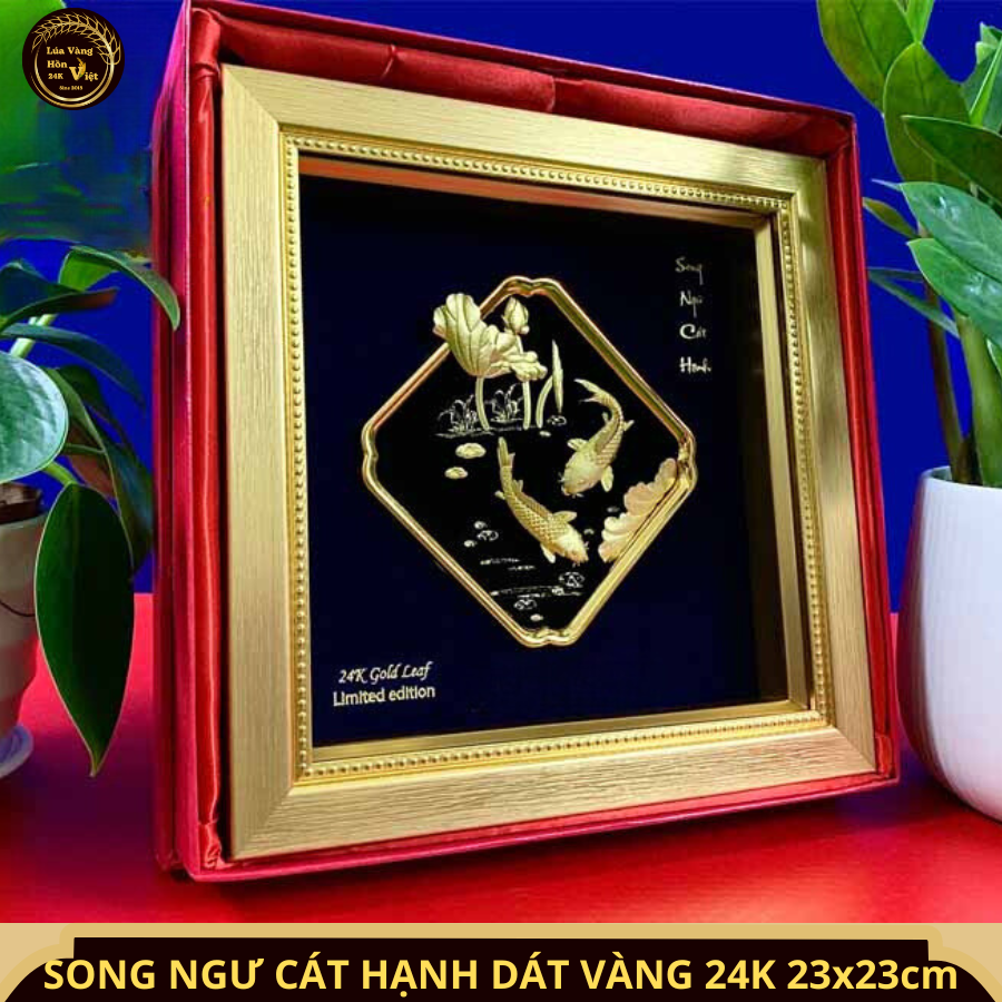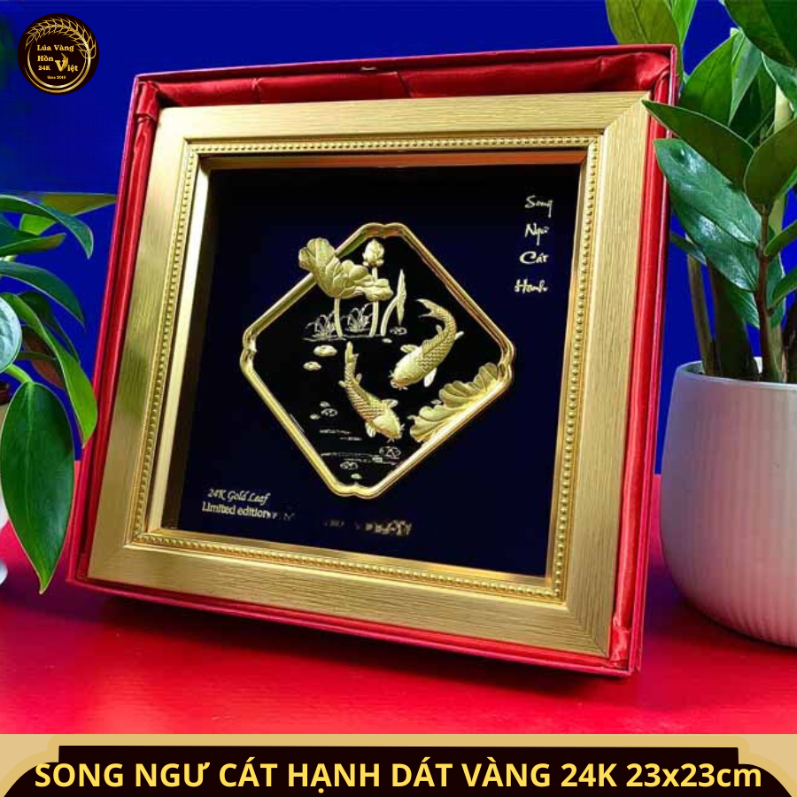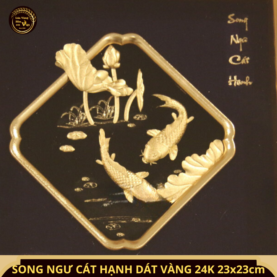 Tranh Song Ngư Cát Hạnh Dát Vàng 24K 23x23cm là tác phẩm nghệ thuật phong thủy cao cấp, mang đến vẻ đẹp tinh tế và ý nghĩa sâu sắc trong từng chi tiết. Được dát vàng 24K, bức tranh không chỉ là món đồ trang trí sang trọng mà còn mang lại những điều tốt lành, may mắn và tài lộc cho gia chủ.