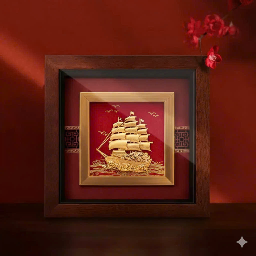 Tranh Thuyền Mạ Vàng 24k kích thước 23cm x 23cm là món quà tặng sang trọng, mang đậm ý nghĩa phong thủy “ Thuận Buồm Xuôi Gió ”, tượng trưng cho sự hanh thông, thuận lợi trên mọi chặng đường kinh doanh và cuộc sống.