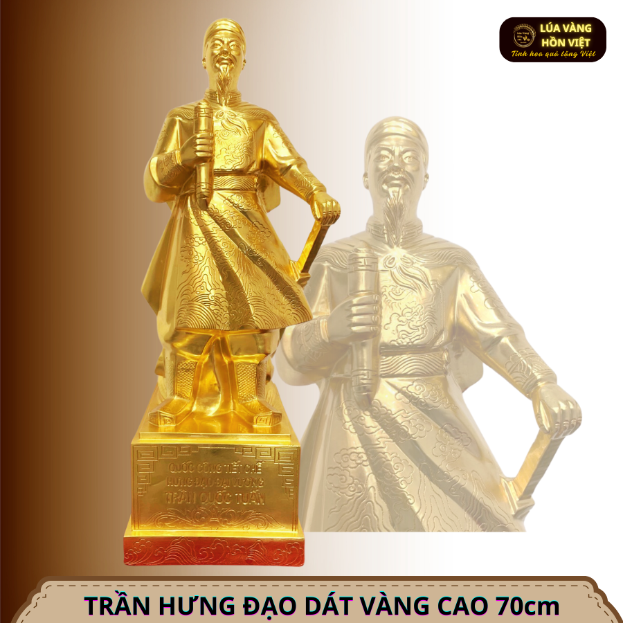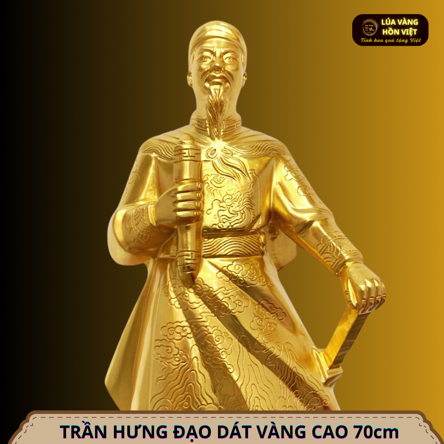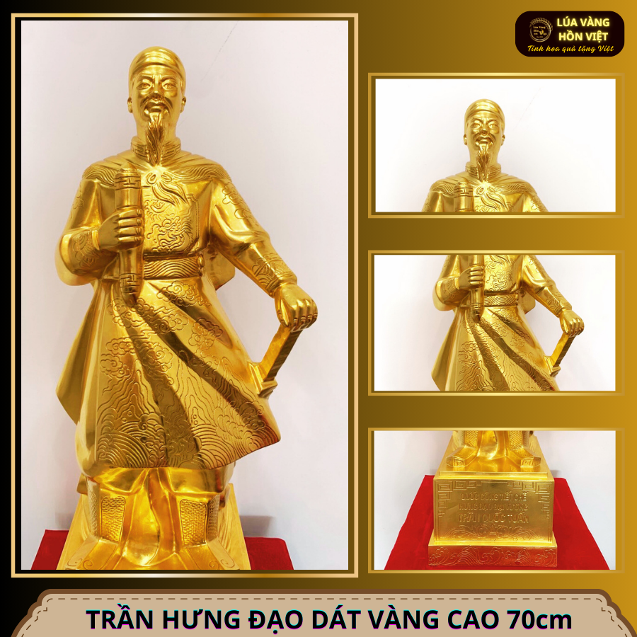 · Tượng đồng Trần Hưng Đạo được đúc từ đồng đỏ sau đó được dát vàng 9999, hoa văn tinh xảo, là mẫu chế tác từ chính tay các nghệ nhân của Lúa Vàng Hồn Việt.